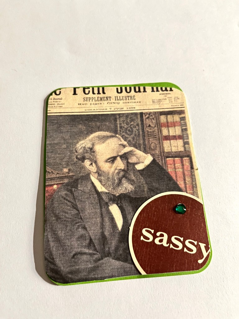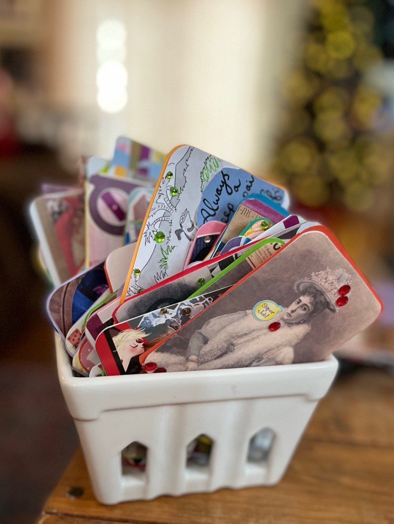My latest foray into paper crafting is making playing-card-sized collages. Most are 2×3, and currently overflowing from the container they’re in, because I don’t yet know what to do with most of them.